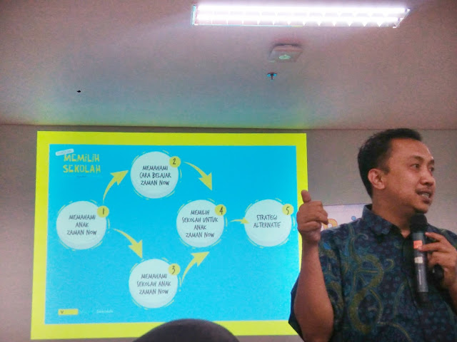 Seminar Memilih Sekolah menghadirkan Bapak Bukik Setiawan sebagai narasumber. Pak Bukik adalah penulis buku "Panduan Memilih Sekolah Anak Zaman Now" (ini buku Pak Bukik yang ketiga, sebelumnya ada buku Anak Bukan Kertas Kosong dan Bakat Bukan Takdir), sekaligus dosen kampus guru Cikal (Sekolah Cikal didirikan oleh Ibu Najeela Shihab). Dulunya, Pak Bukik juga sempat menjadi dosen di Fakultas Psikologi Universitas Airlangga Surabaya. Jadi seminar-nya benar-benar menghadirkan narasumber yang tepat menurut saya.