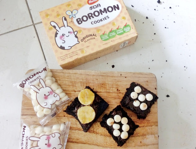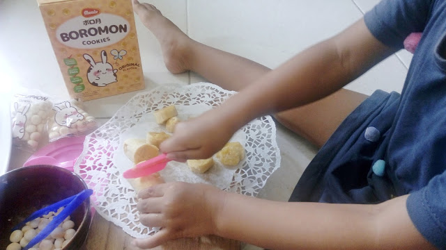 Alhamdulillah Aliyah suka sekali dengan kue buatannya :) Selain karena Aliyah suka kue, topping yang digunakan juga merupakan cemilan kesukaan Aliyah, si cookies gemas Monde Boromon Cookies.