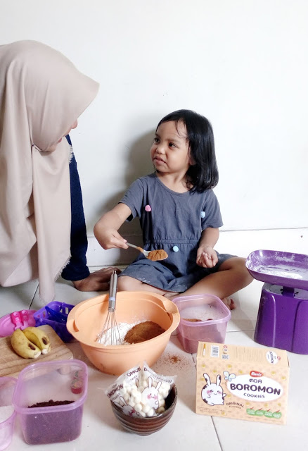 Jika sebelumnya beberapa aktifitas diatas Aliyah lakukan di waktu yang tidak bersamaan, maka kali ini saya mencoba kembali menciptakan momen berharga antara saya dan Aliyah dengan menggabungkan beberapa dari aktifitas diatas di dalam satu kegiatan yang kami lakukan bersama. Aliyah saya ajak untuk membuat kue bersama saya. Ini adalah kali pertama Aliyah membantu saya membuat kue yang sebagian besar aktifitas membuat kue nya dilakukan oleh Aliyah. Kami membuat kue coklat dari tepung gluten free dengan selai coklat dan toppingMonde Boromon Cookies cemilan kesukaan Aliyah, juga buah pisang sebagai topping tambahan. Stimulasi apa saja yang didapatkan Aliyah melalui momen pertamanya dalam membuat kue? 1. Belajar mengenal bahan, warna dan tekstur Komposisi kue yang membutuhkan berbagai macam bahan dapat membantu Aliyah belajar untuk mengenal aneka bahan, warna dan tekstur. Aliyah belajar mengenal tepung yang berwarna putih, bubuk coklat yang berwarna cokelat, gula palem yang berwarna coklat muda dengan tekstur yang lebih kasar, dan mentega yang berwarna kuning dengan tekstur lembut namun lengket di tangan.